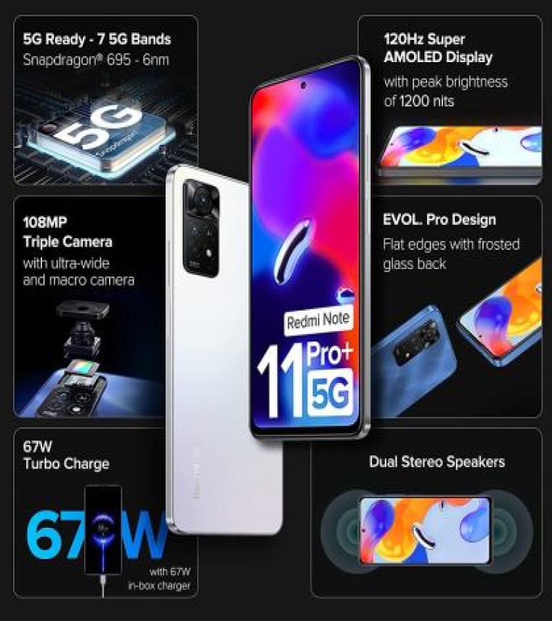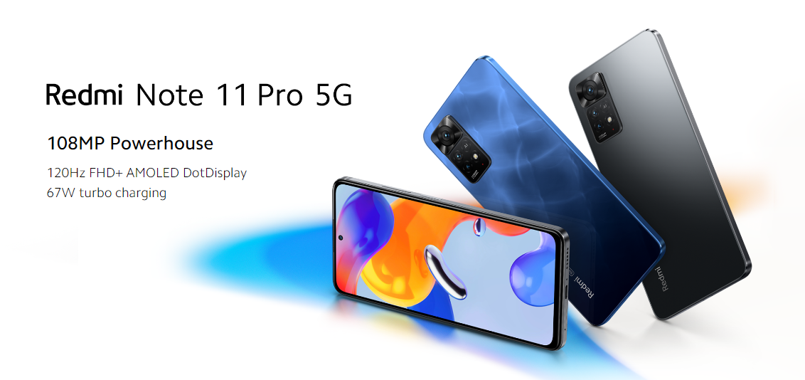 Redmi Note 11 Pro 5GHighlights Incredible Performance5G ArrivedOutstanding Photograph Main CameraMacro CameraUltra Wide Camera 120Hz display gives you a higher refresh rate which will feel smoother and faster to use. Feast Your Eyes With Vibrant Details A massive 5000mAh battery that ensures you don't run out of battery while you are on the go.