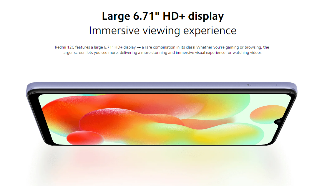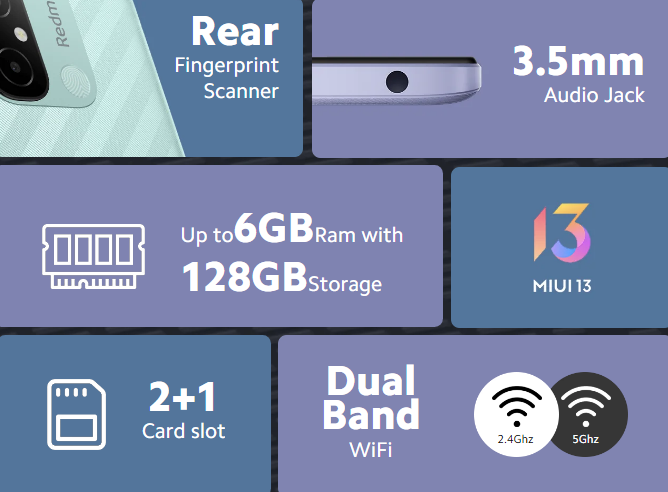 Xiaomi Redmi 12CKey Features AI Dual Camera Camera Samples Powerful Processor Enhanced SmoothnessMicroSD Card Support Go Big On Entertainment5000mAh Massive Battery Rear Fingerprint Sensor