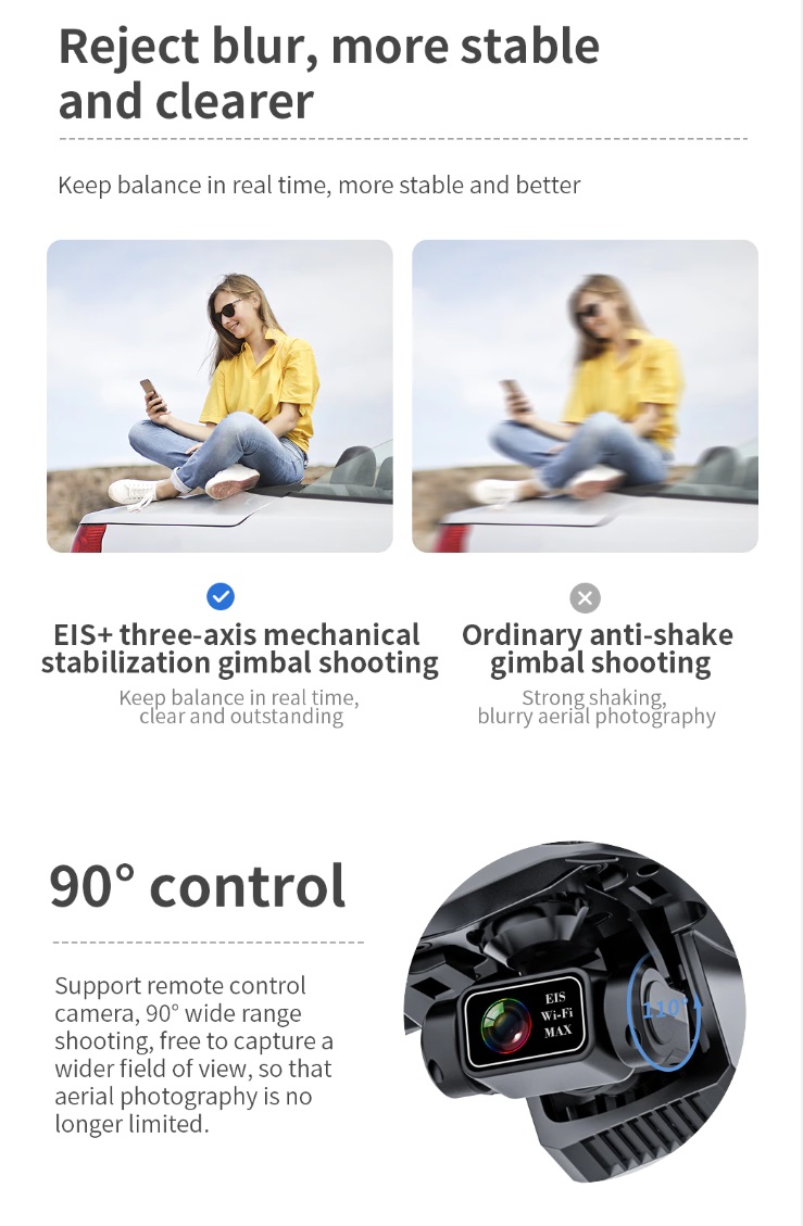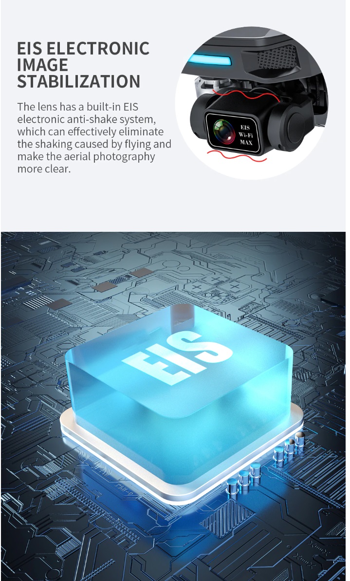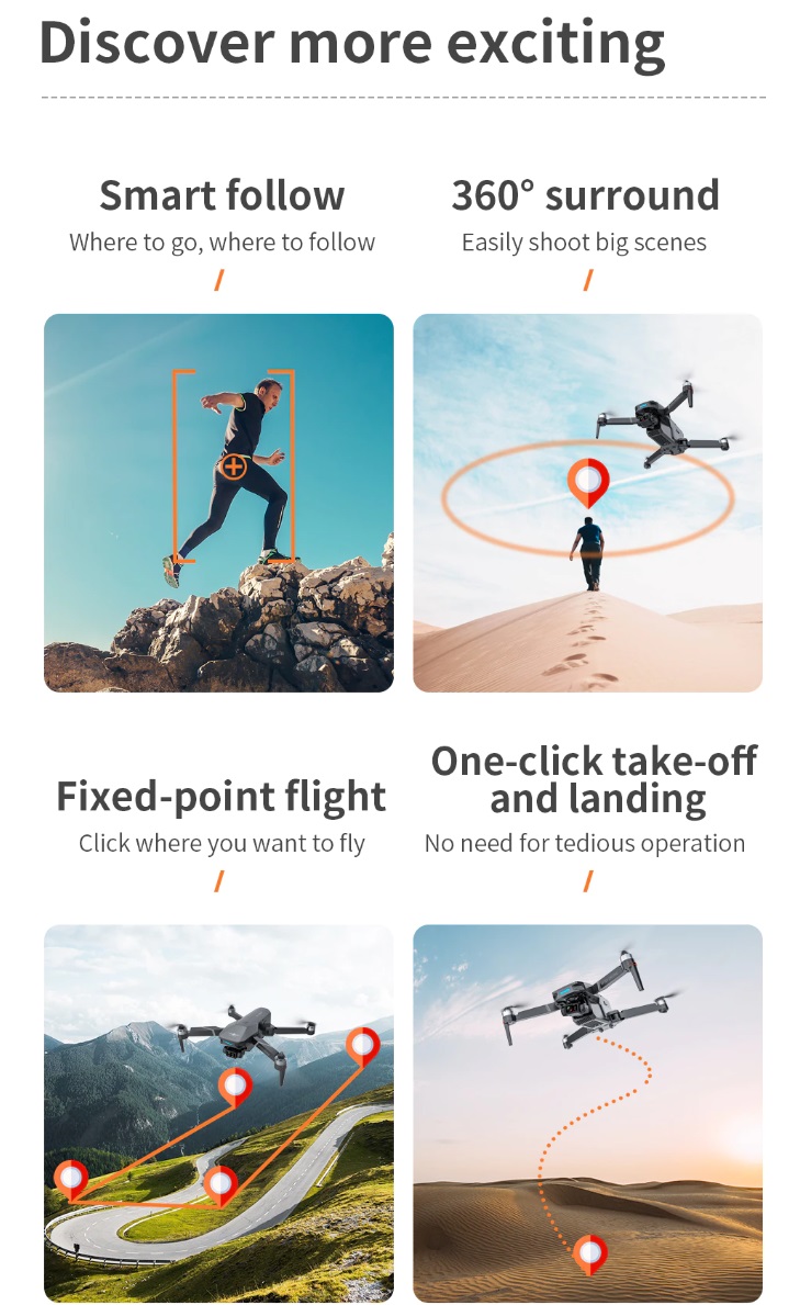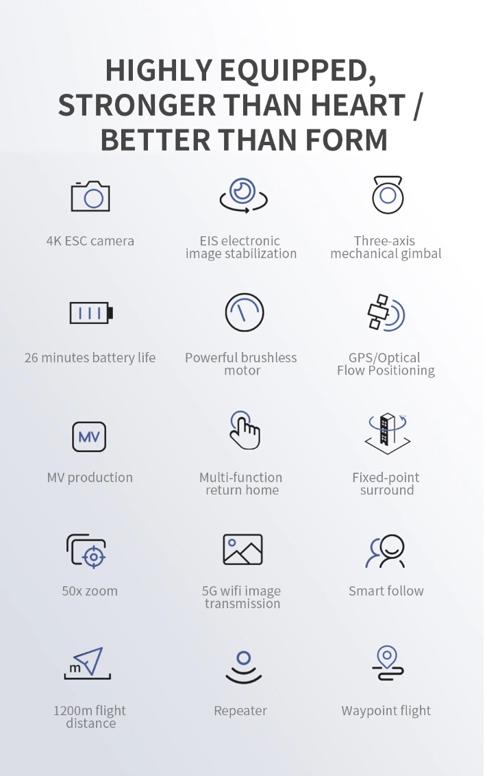 -- Three axis Electronic Stabilization gimbal -- EIS electronic image stabilization camera -- GPS/GLONASS double mode -- 1200 M remote control distance (Outdoor and unobstructed, depend on conditions and mobile device) -- 500 M HD image transmission distance (Outdoor and unobstructed, depend on conditions and mobile device) -- Real-time image transmission -- Intelligent follow -- Surround flight -- Waypoint flight -- Point of Interest -- Visiting Trace -- Image Scaling -- Folding portable fuselage -- One key return -- Video Editing -- Gesture control -- Brushless motor -- MV functions: filters, video effects, add background music, picture / video sharing